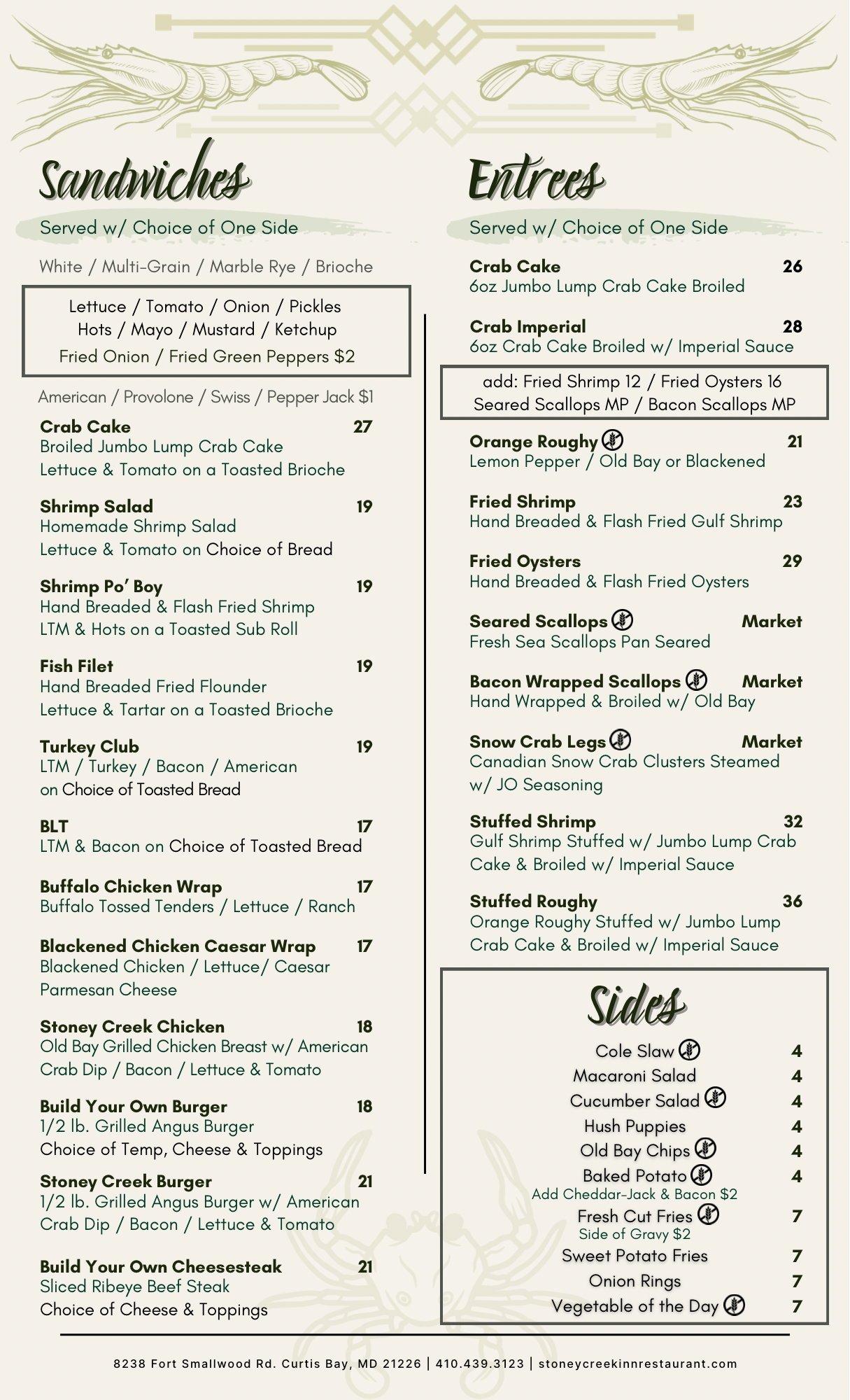 Sandwiches served with choice of one side Breads: White, Multi-Grain, Marble Rye, Brioche, Flour Tortilla, or Bed of Mixed Greens. Toppings: Lettuce, Tomato, Raw Onion, Pickles, Hots, Mayo, Mustard, Ketchup, Fried Onions, Fried Green Peppers (+$2)